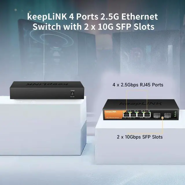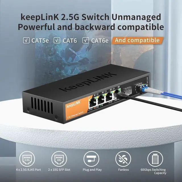 2.5Gbps Network Switch: 6 Port 2.5G network switch with 4 x 2.5G RJ45 ports and 2x 10G SFP slots. Compatible 1G/2.5G/10G Module, not include SFP Module. Compliant IEEE IEEE802.3bz (2.5G).