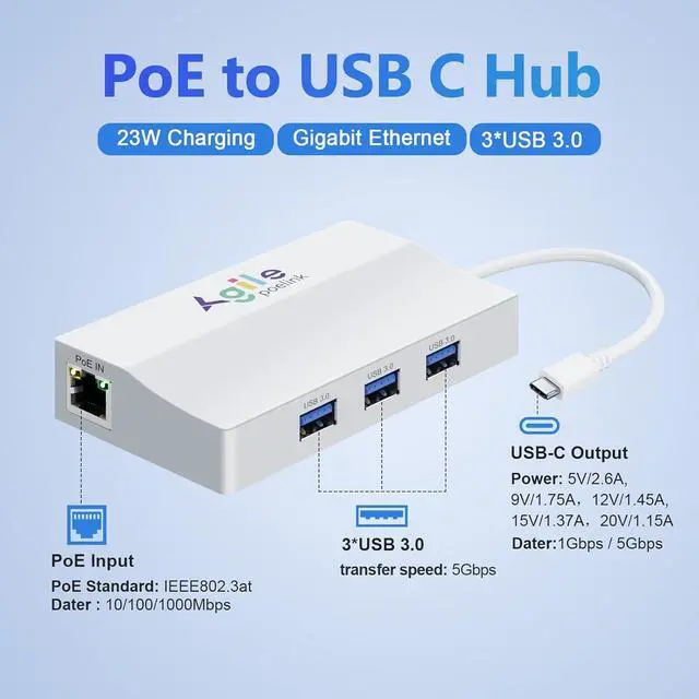 Our product is an innovative USB-C to POE (Power over Ethernet) adapter. It works simply by connecting a single Ethernet cable to our product, and the other end connects to your network device (such as a tablet, phone, wireless access point, webcam, etc.). It simultaneously powers the device and transmits network data, eliminating the need for bulky dedicated power adapters and tangled cables.