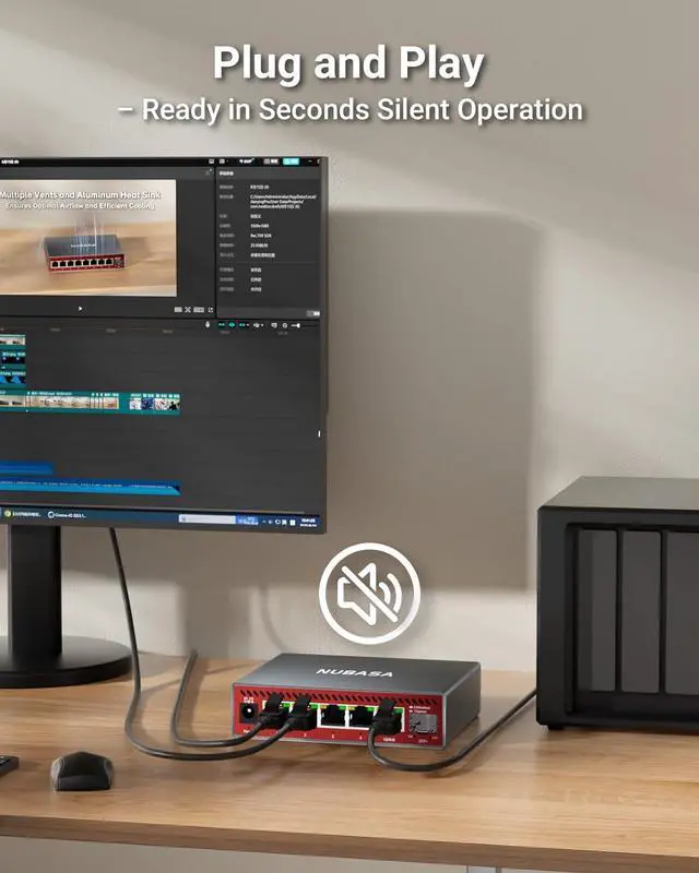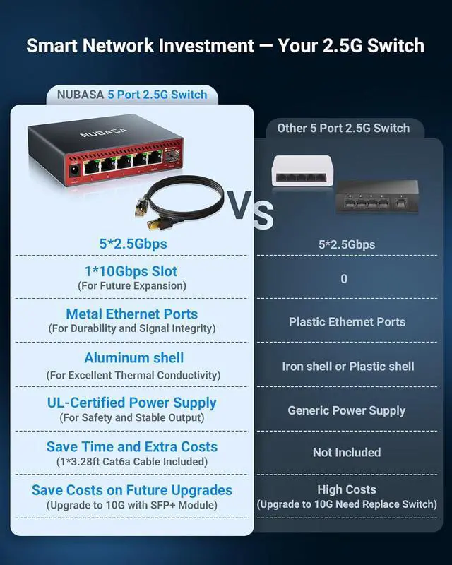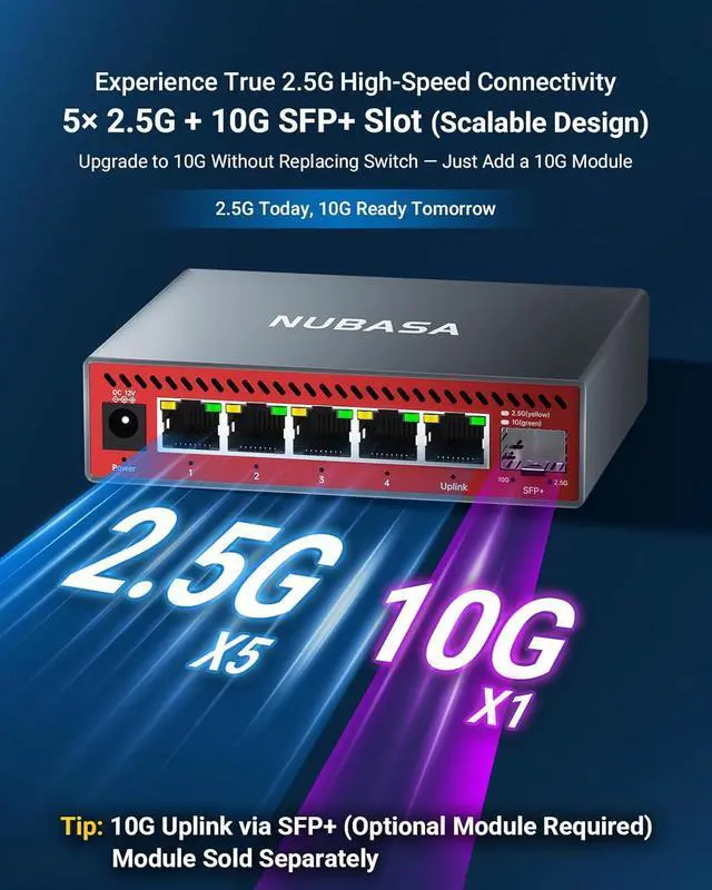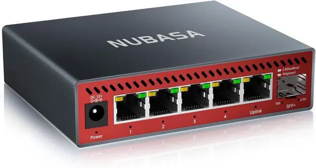 Experience faster data transfers with the NUBASA 5-port 2.5G ethernet switch, featuring five 2.5Gbps RJ45 ports and one 10Gbps SFP+ uplink port. Ideal for high-speed connections between NAS, gaming consoles, PCs, and workstations, supporting 10/100/1000/2500Mbps auto-negotiation for seamless compatibility