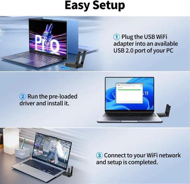 More Stable and Wider: With 2 adjustable high-gain antennas, usb wireless adapter greatly improves wifi signal strength, transmission speed, coverage and stability, making it easy to experience 4K video streaming, gaming and online work