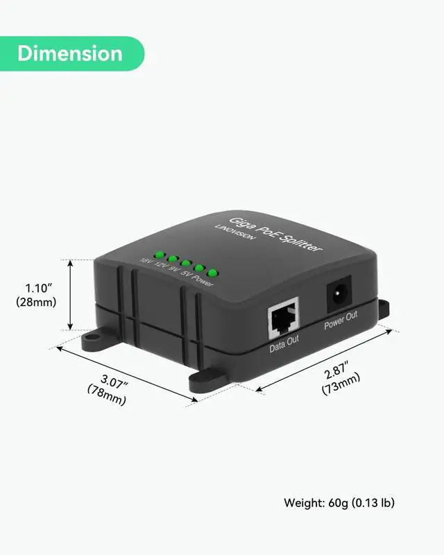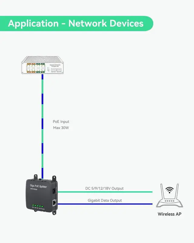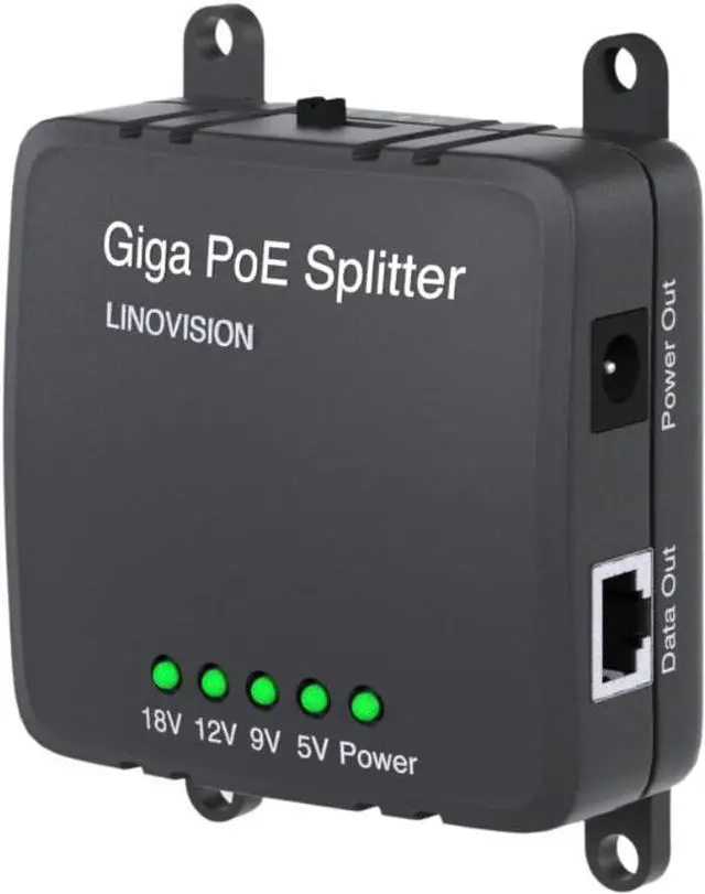 GIGABIT PoE SPLITTER - Split IEEE802.3af/at PoE to 10/100/1000Mbps Data and DC 5/9/12/18V output.