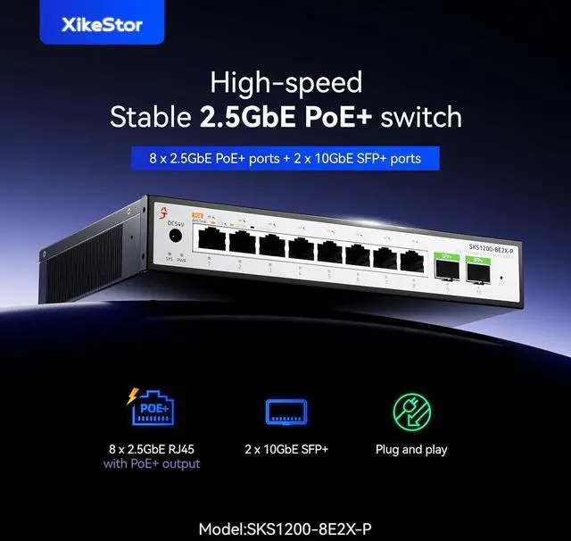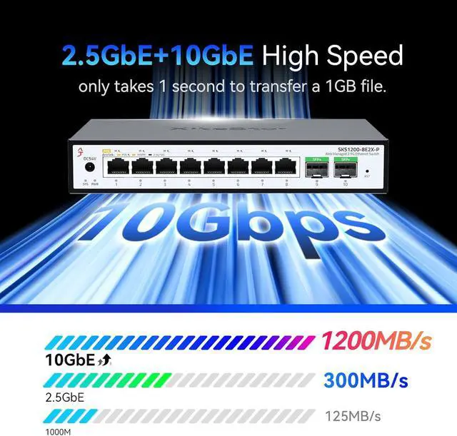 2.5G High-Speed LAN TransmissionEquipped with 8 x 2500M RJ45 PoE ports that auto-negotiate 100/1000/2500M speeds, and 2 x 10G SFP+ optical ports supporting 1G/2.5G/10G rates. All ports are capable of 2500M transmission, allowing simultaneous connection of end devices such as NAS and computers to build a 2.5G high-speed LAN environment.
