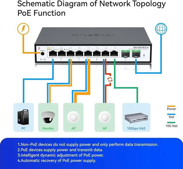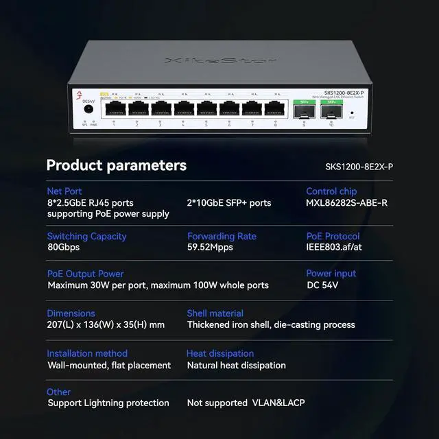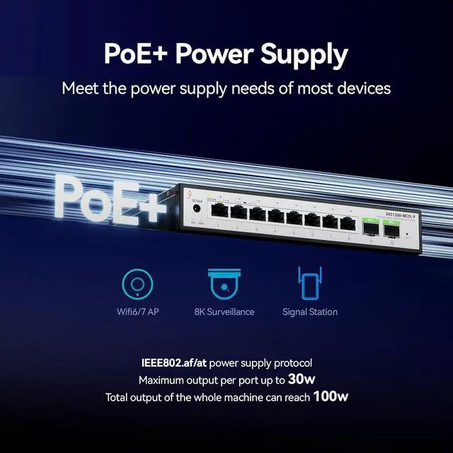 International PoE Power SupplyThe 2.5G electrical ports feature intelligent power supply and support the 802.3AF/AT protocols. Each port can provide up to 30W of power, with a total output power of 100W. It automatically identifies powered devices to supply power, stops power supply for non-powered devices, and retains the switchs data exchange function.