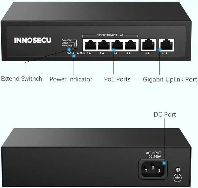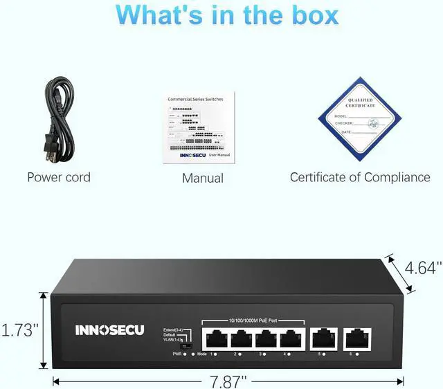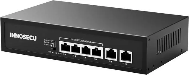 6-Port PoE Switch with Reliable Power Delivery:This switch features 4 PoE-enabled ports (10/100/1000Mbps) and 2 Gigabit Ethernet uplink ports (10/100/1000Mbps). Compliant with IEEE 802.3af/at standards, it delivers up to 30W per PoE port with a total power budget of 65W, capable of powering 4 PoE devices simultaneously.