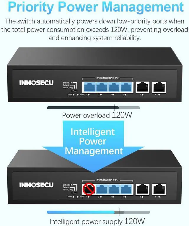 Priority Power Management: Incorporates an intelligent power allocation system that automatically disables lower-priority ports when total power exceeds 65W, ensuring continuous operation for critical devices while preventing system overload.