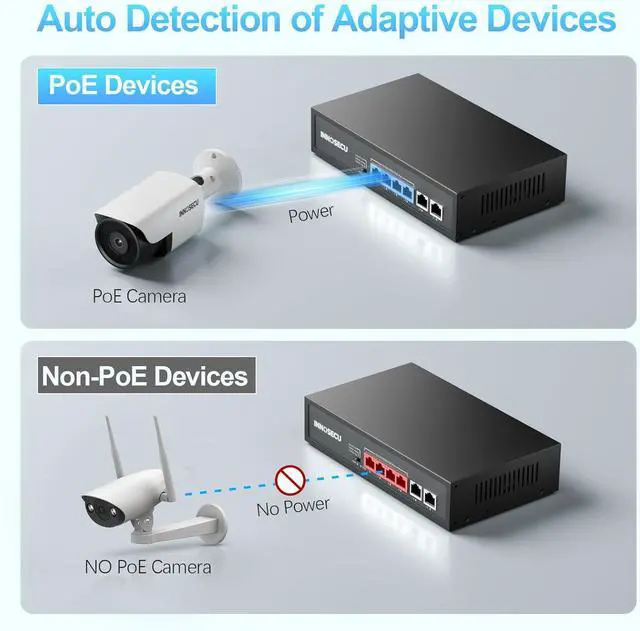 Auto PD Detection: Intelligently identifies connected PoE devices (PDs) and only supplies power to IEEE-compliant terminals, preventing potential damage to non-PoE equipment.