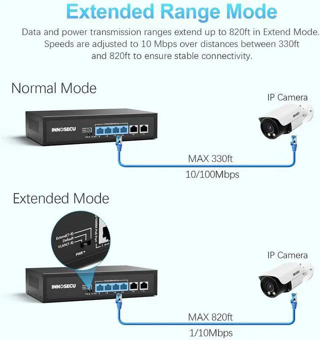 250m Extended Reach Technology: 3~4 Ports PoE can extend the maximum transmission distance for both power and data from 100m to 250m, significantly reducing cabling challenges and installation costs.