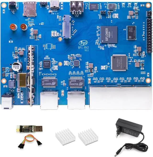 [Siflower SF21H8898 SoC] The Banana Pi BPI-RV2 RSIC-V OpenWRT Open Source Samrt Gateway Router Board is a Siflower SF21H8898 SoC-based device with 512MB DDR3 memory, 128 MiB NAND, 16 MiB NOR Memory, and supports PoE network power.