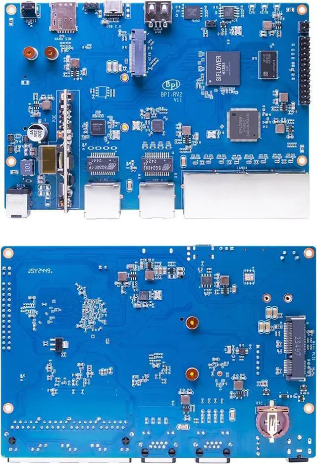 [Stable Network Environment] The Banana Pi BPI-RV2 RSIC-V open-source gateway Router board on the network side supports QSGMII, SGMII/HSGMII, and RGMII outlets, and IEEE 1588 PTP for time synchronization, and NVMe SSDs (PCIe gen 2 x1) are supported on the M.2 2242/2230 outlets. Supports connection of SSD drives, 5G modules, WiFi modules, wired grid cards, etc.