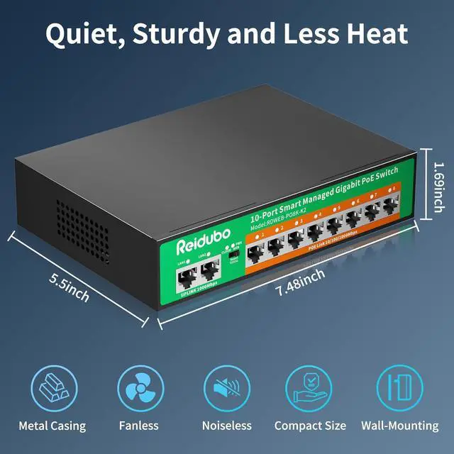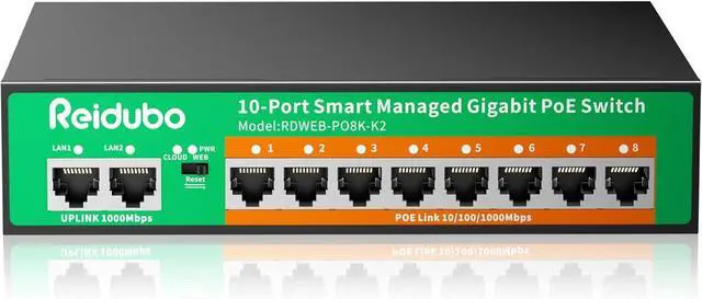 10-Port Gigabit PoE SwitchThe Reidubo 10-Port cloud managed PoE+ Switch is engineered to meet the demands of modern networking environments. Equipped with 8 Gigabit managed PoE ports and 2 Gigabit uplink ports. It adheres to the IEEE802.3af/at standard, ensuring seamless power and data transmission over a single cable. With the capability to deliver up to 30W of power per PoE port and a cumulative 120W across all PoE ports. It is important to note that for passive PoE or non-PoE devices, only data transmission is supported.