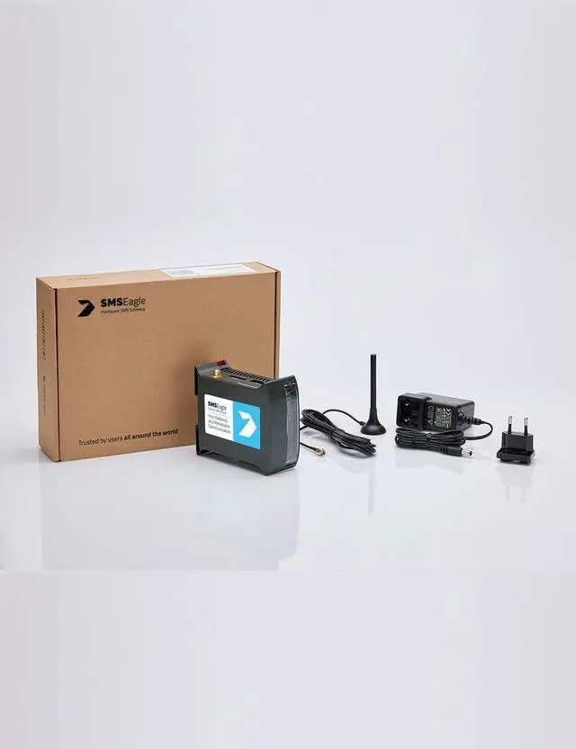 SMSEagle package includes: SMSEagle hardware SMS gateway | Omnidirectional 2dBi UMTS/LTE antenna | AC|DC Adapter (input voltage: 100-240V) | Quick-start guide | 12-month warranty | Access to free software upgrades within warranty period