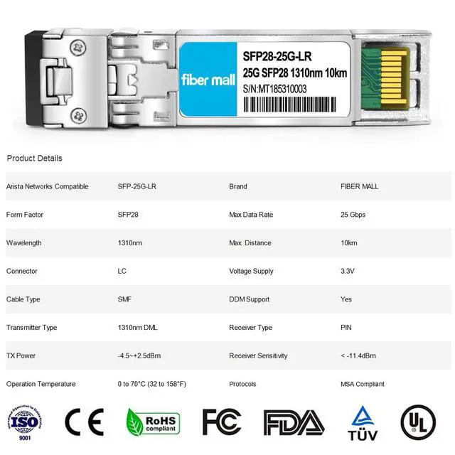 The SFP28 LR transceiver is a single-channel, pluggable fiber SFP28 optical module for 25 Gigabit Ethernet and Infiniband EDR. Moreover, the 25G LR module supports communication and interconnection applications with a transmission distance of up to 10km.