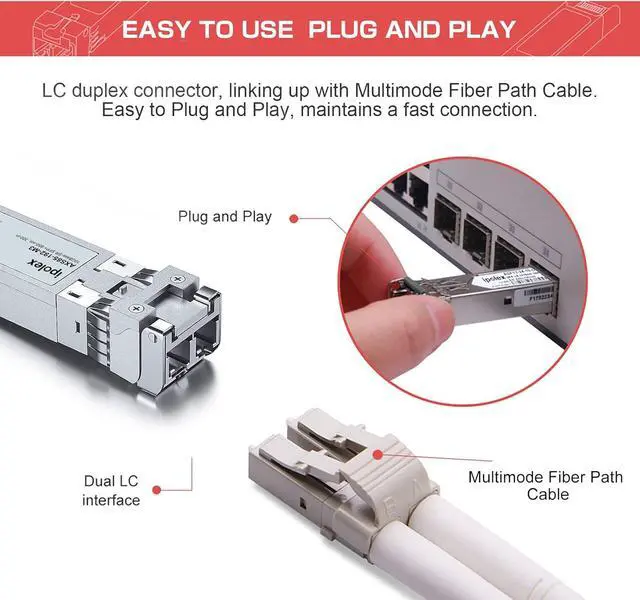 [10Gbe SR SFP+ Module] Data Rate: 10Gb/s; Wavelength: 850-nm; Interface: Dual LC Connectors with DDM. Reaching up to 300 meters transmission over OM3/OM4 multi-mode Fiber patch cable. (MMF, Supports both 62.5um and 50um LC cables.)