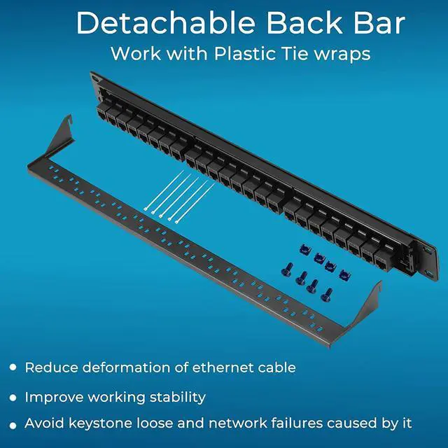 This patch panel wall mount contains thick steel detachable back bar. With zip ties, it can effectively reduce the deformation of the ethernet cable, improve the working stability of the network connection port, and avoid keystone loose and the occurrence of network failures caused by the loosening and deformation of the cable. What you get? 24 pcs sturdy cat6 coupler keystone loaded patch panel wall mount, removable cable back bar, screws, tie wraps.