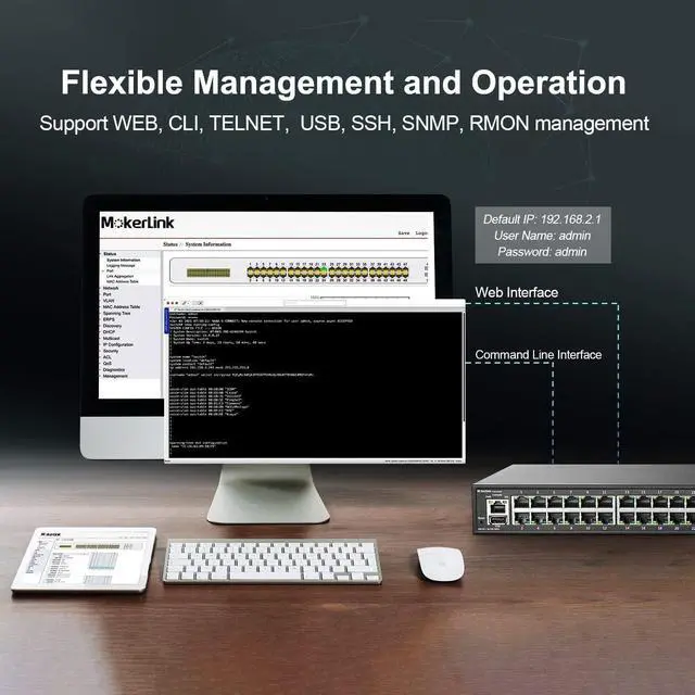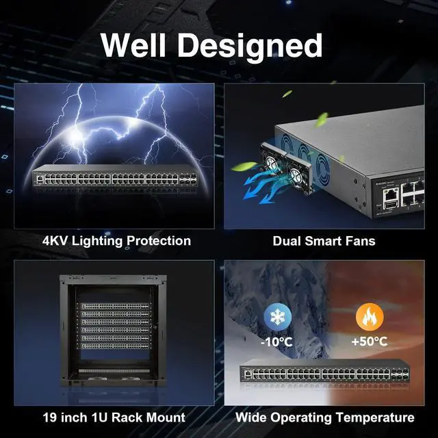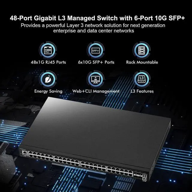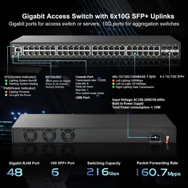 Ethernet 48 * 10/100/1000Mbps RJ45 Port + 6 * 10G SFP Port + 1 * RJ45 Console Port + 1 * USB Port