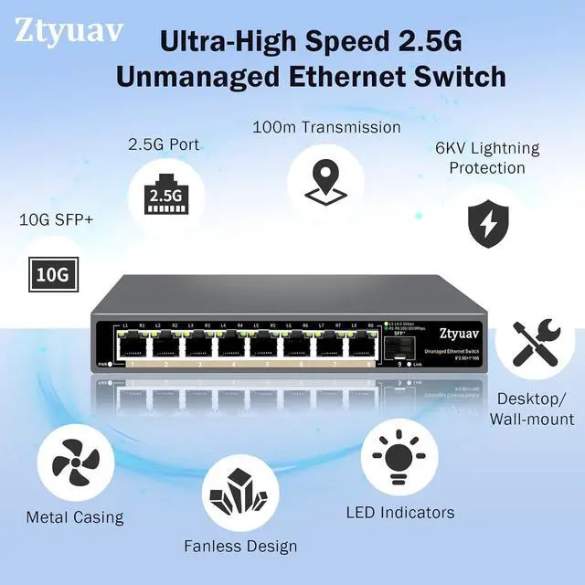 9 Port Unmanaged 2.5G Ethernet Switch with 8 x 2.5G RJ-45 Base-T Ports, 1 x 10G SFP+, Ports Speed Auto-Negotiation-100/1000/2500Mbps, Desktop/Wall Mount, Fanless & Metal
