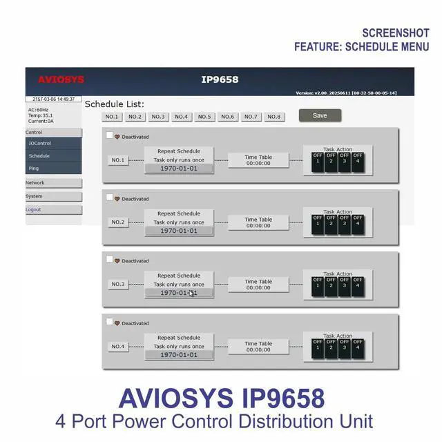 - SCHEDULING. Task Scheduler allows you to schedule and run actions with your pre-defined timetable. Up to 8 timetables by day or week or once can be set.