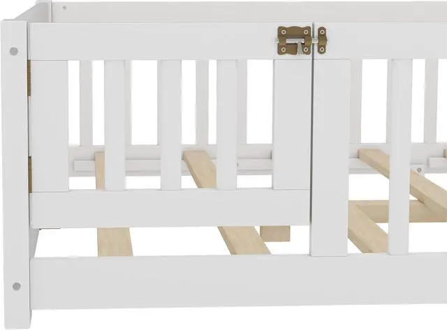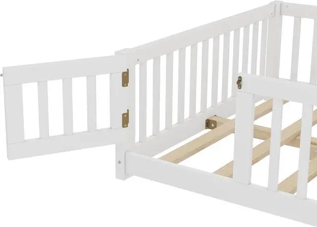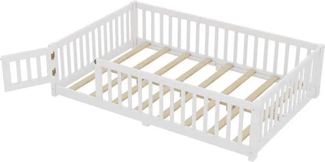 Bellemave Full Size Montessori Floor Bed Frame with Rails & Door, Solid Wood Kids Floor Bed Full with Removable Slats, Low Profile Montessori Bed for Childrens Sleep & Play, White