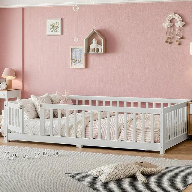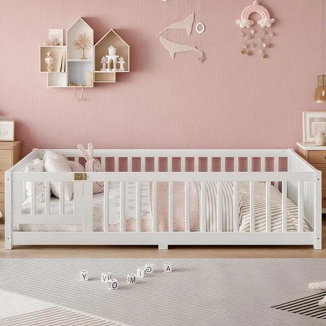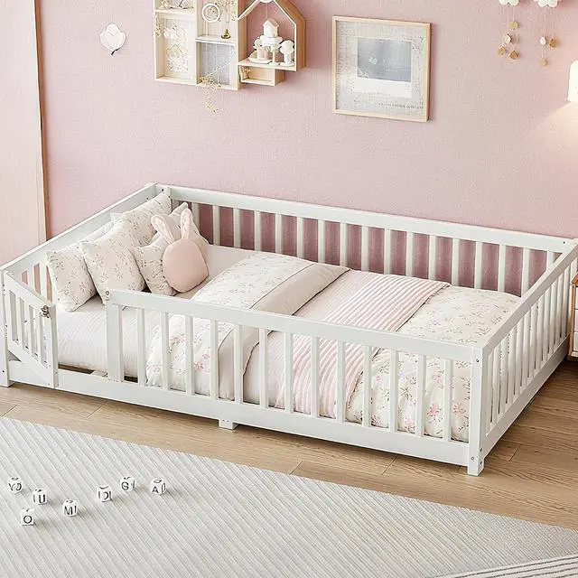 Safe Montessori Full Floor Bed DesignThis full size floor bed with low profile and surrounding rails offers a safe space close to the ground, reducing fall risks. The playful door design creates a cozy area for sleep and exploration, making it the perfect montessori floor bed full