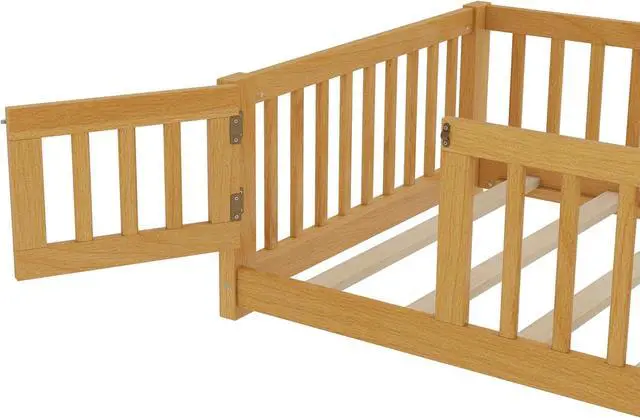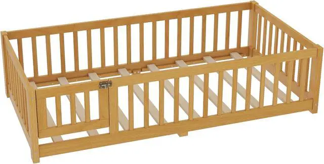 Bellemave Montessori Twin Floor Bed Frame with Fence and Removable Door, Low Profile Twin Size Montessori Bed Frame for Kids, Solid Wooden Floor Beds for Bedroom,Nursery, Natural