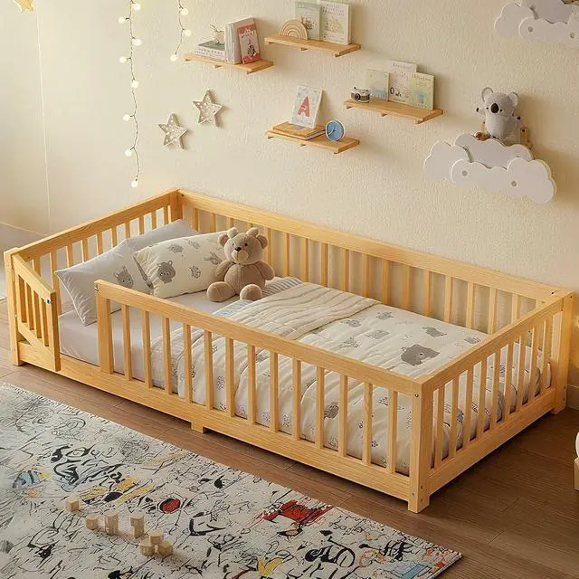 Safe Montessori Full Floor Bed DesignThis full size floor bed with low profile and surrounding rails offers a safe space close to the ground, reducing fall risks. The playful door design creates a cozy area for sleep and exploration, making it the perfect montessori floor bed full