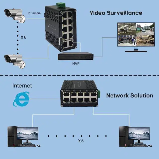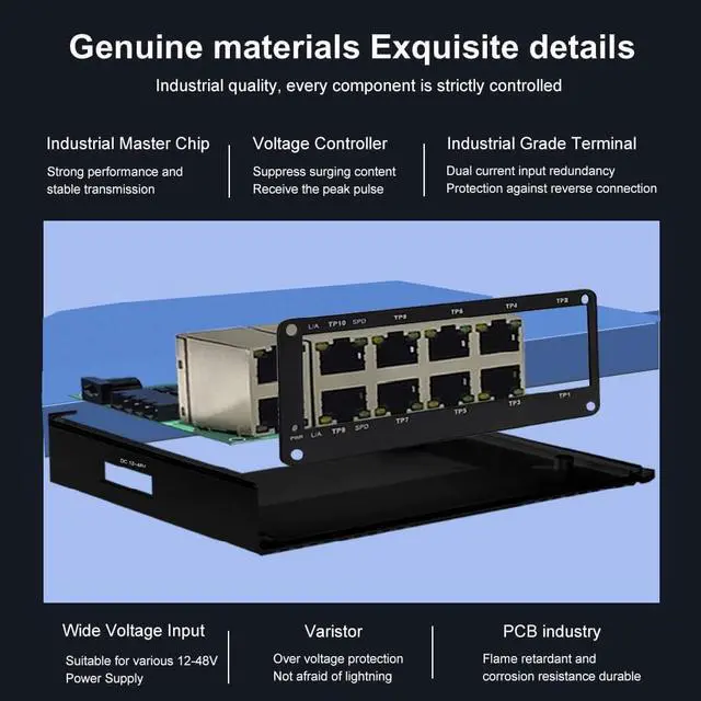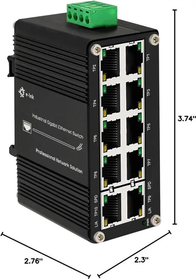 Compact Size, Easy to installation The 10 ports Ethernet Switch size is 3.74x2.76x2.3in, it only need small space to install.