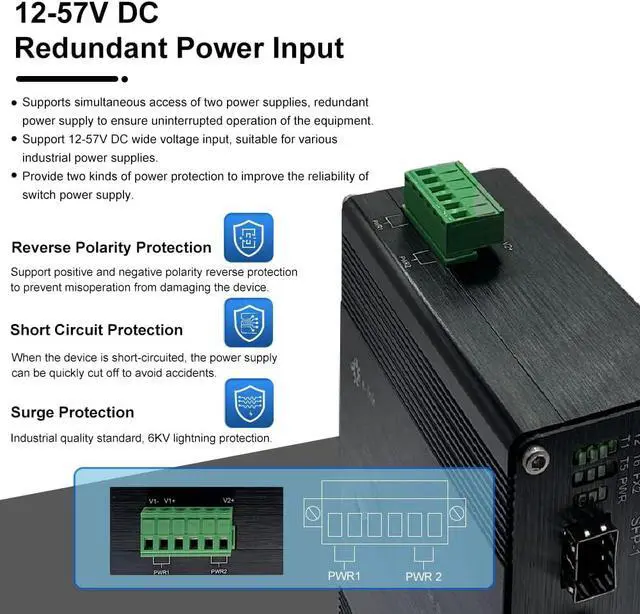 12~48V DC Input: The switch support 12~48V DC Input and boost to 48V output. It will solve the problem that you only have 12V or 24V centralized power supply or solar power supply. And also support Redundant power.