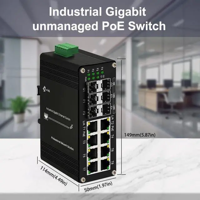Compact Size, Easy to installation The 10 ports Ethernet Switch size is 3.74x2.76x2.3in, it only need small space to install.