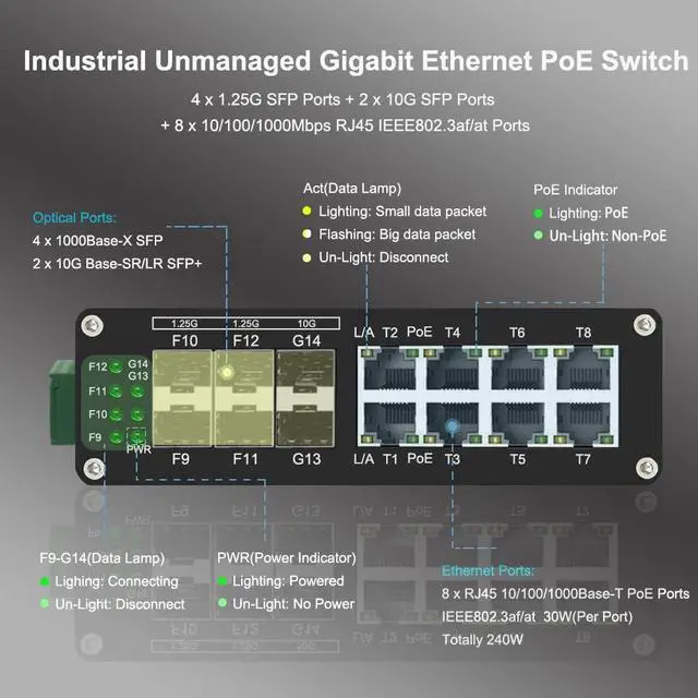 Industrial 8 Port Gigabit Ethernet Plus PoE Switch with 2x10G SFP+ and 4X 1G/2.5G/10G/Multi-gig SFP, 240W High Power, Support IEEE802.3af/at, Rack Mount Unmanaged Plug and Play Ethernet Switch