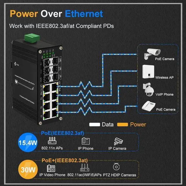 12~48V DC Input: The switch support 12~48V DC Input and boost to 48V output. It will solve the problem that you only have 12V or 24V centralized power supply or solar power supply. And also support Redundant power.