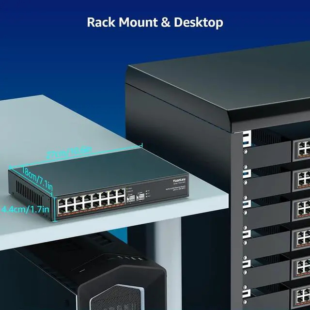 18 Port 2.5G Umanaged Ethernet Switch, 16 x 2.5Gb Base-T Ports, 2 x 10G SFP+, Compatible with 100/1000/2500Mbps, Metal Fanless, Desktop/Rack Mount YuanLey 2.5Gbe Network Switch for Wireless AP, PC