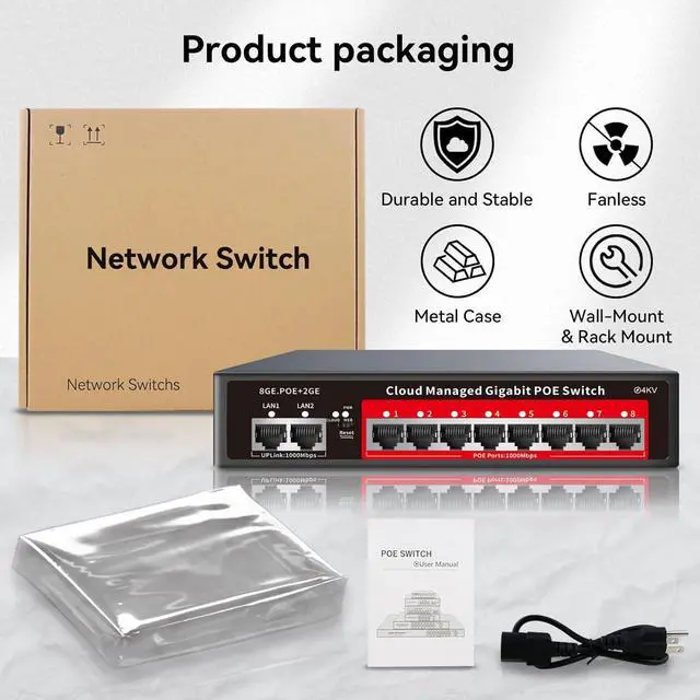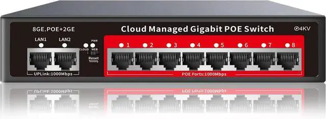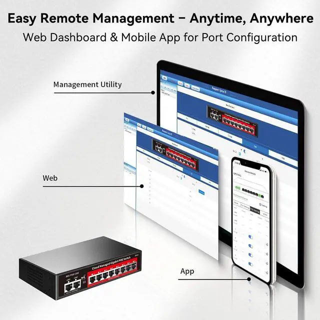 Cost-Effective, Durable Design for Long-Term Use: 8-port PoE+ ethernet gigabit switch features a rugged casing and advanced heat dissipation, paired with low-power, fanless operation for silent, long-lasting performanceeven under heavy loads. Plus, its intuitive visual interface simplifies remote management: easily monitor network status, configure devices, and troubleshoot on-site issues without needing to be physically present.