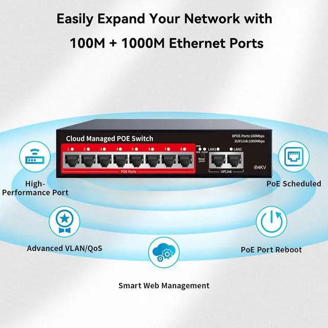 Cost-Effective, Durable Design for Long-Term Use: 8-port PoE+ ethernet gigabit switch features a rugged casing and advanced heat dissipation, paired with low-power, fanless operation for silent, long-lasting performanceeven under heavy loads. Plus, its intuitive visual interface simplifies remote management: easily monitor network status, configure devices, and troubleshoot on-site issues without needing to be physically present.