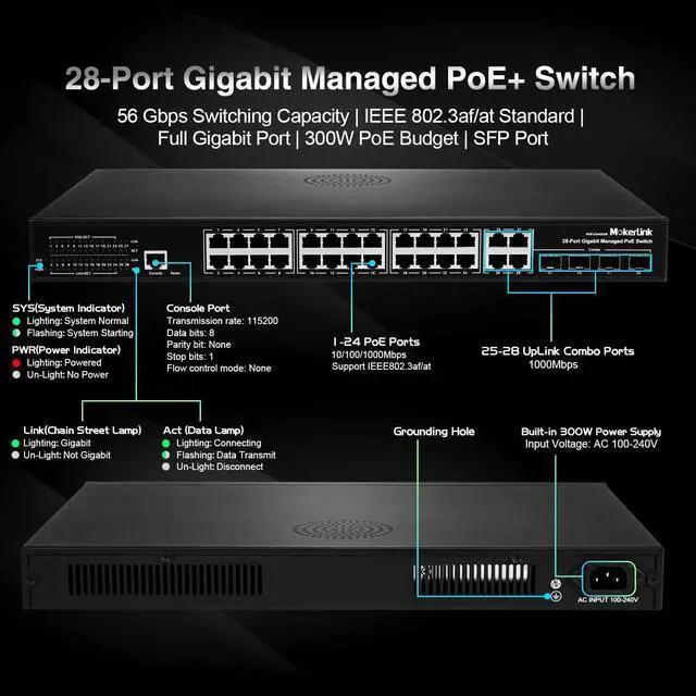 28 Gigabit Ports: Includes 24 Gigabit PoE ethernet ports, 4 Gigabit Ethernet UpLink, 4 Gigabit Combo SFP Ports. Switching capacity is 56 Gbps, each port can reach 1G rate at the same time, with high speed transmission; 4 Combo SFP UpLink, can be more flexible and long distance to connect to different network devices, support DDM, can check the status of the optical module.