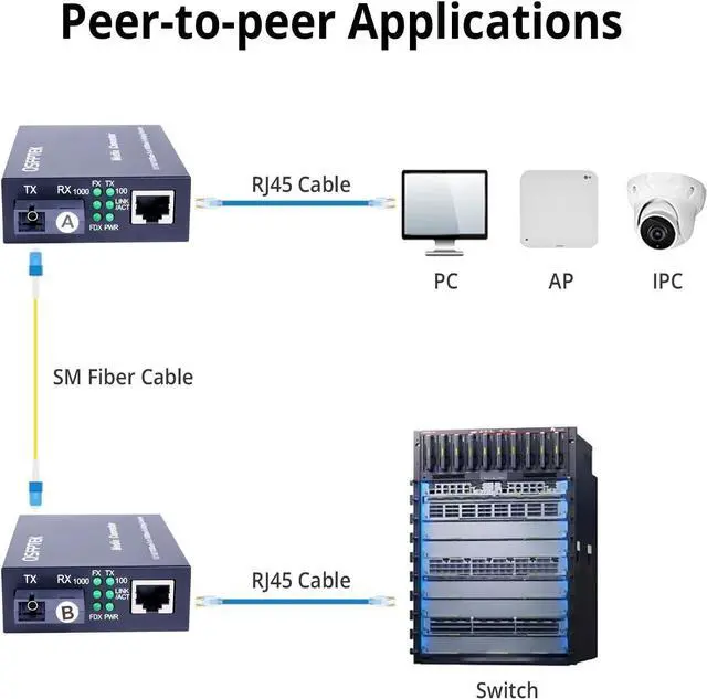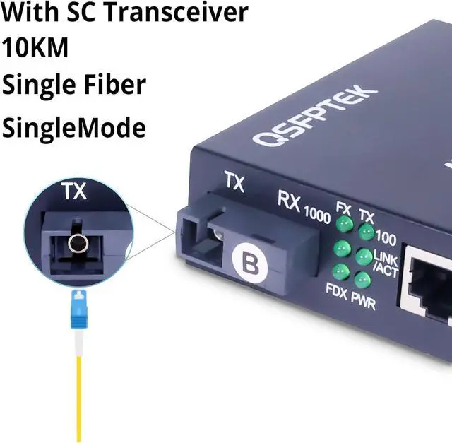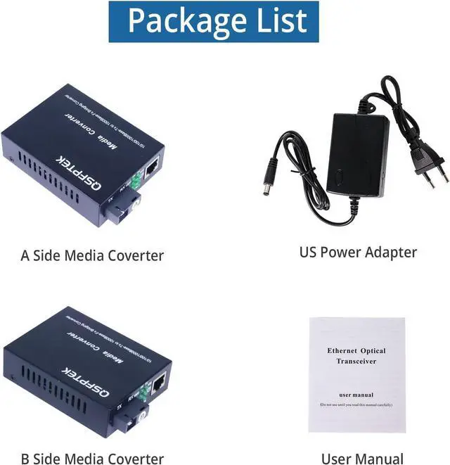 3.Fiber Type:Single-mode, Fiber Connector: Single SC Fiber, Wavelength:1310nm, Reach:10km, included power supply. Weight:0.30kg