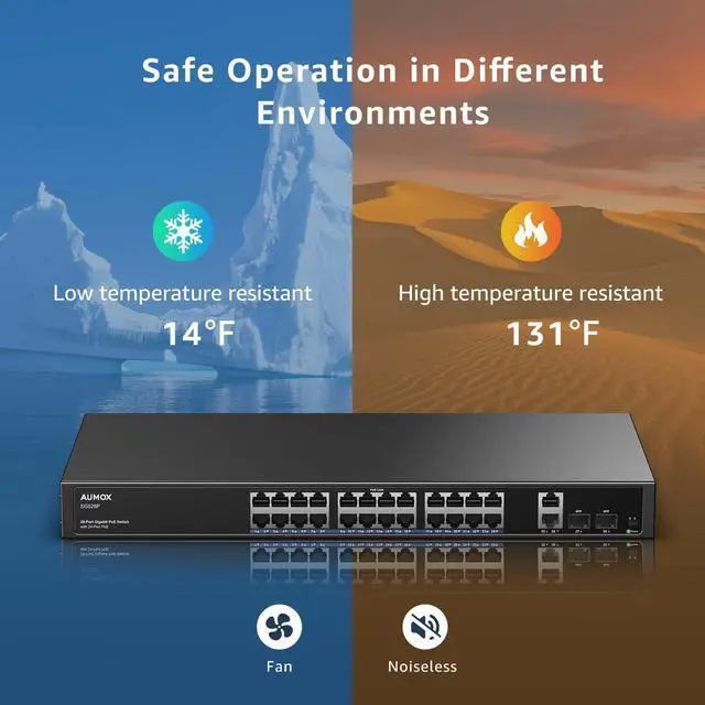 PoE Switch: Aumox gigabit PoE Ethernet switch offers 26*10/100/1000 Mbps Base-TX RJ45 ports, including 24 PoE ports, automatically identifies and powers PoE devices. And 2 Gigabit SFP slots for high-speed connections. With 400W total power output, supply power to wireless AP, IP Camera, VOIP Phones and much more.