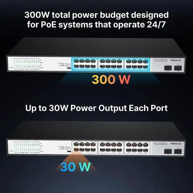 HIGH PERFORMANCE Compliant with IEEE 802.3 af/at Network protocol standard, supports PoE power up to 30W for each PoE port (Total of 300W PoE power budget). Compact & Sturdy Metal Housing design makes it safe to use in various environments