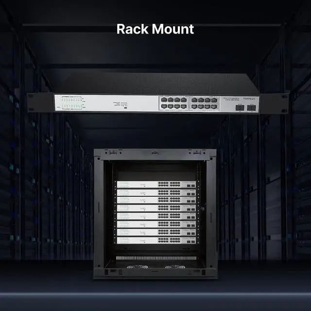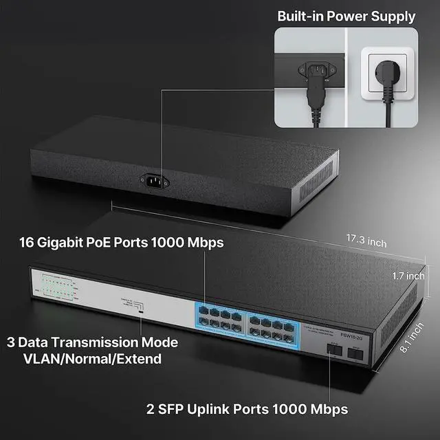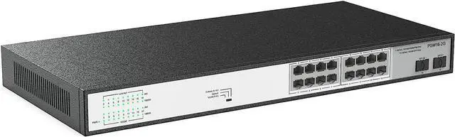 Poe switch with 802.3 af/at compliant16-Ports 10/100/1000 switch with 2*Gigabit uplink SFP ports, providing up to 30W per port and total PoE power budget of 300W. The 2 uplink ports can be connected to different networks or devices, such as routers, NVRs