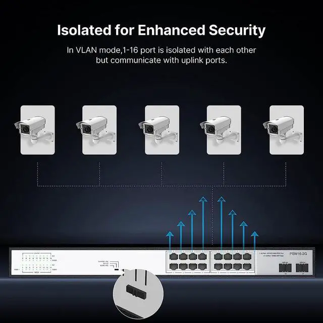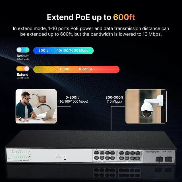 Extend and VLAN FunctionUp to 600ft data and power PoE transmission range under Extend Mode, ideal for surveillance system (Speed will be reduced if extend function is operating). Port-Based VLAN When you enable VLAN mode, the PoE port is isolated from each other, but communicate with uplink ports, improving network performance.