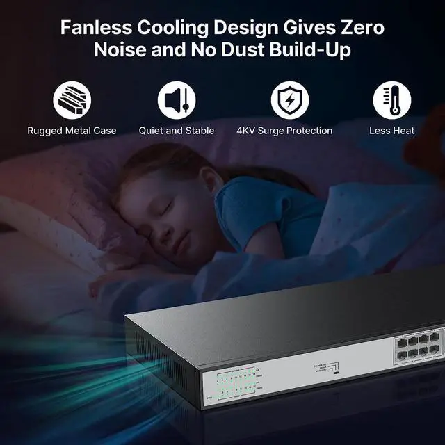 Unmanaged Plug and PlayEasy setup with no software installation or configuration needed, support power detection function, automatically detects devices, will not burn non-standard PoE devices or standard PoE switch