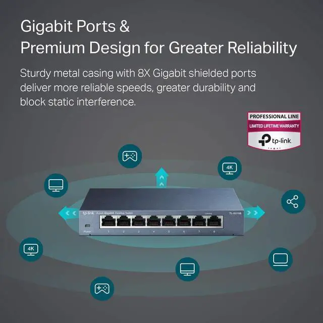 Increase the reliability of your connected devices with the TL-SG108 8-port Gigabit desktop switch. 8x non-blocking gigabit ports enable instant transferring of large, bandwidth-intensive files without interference.