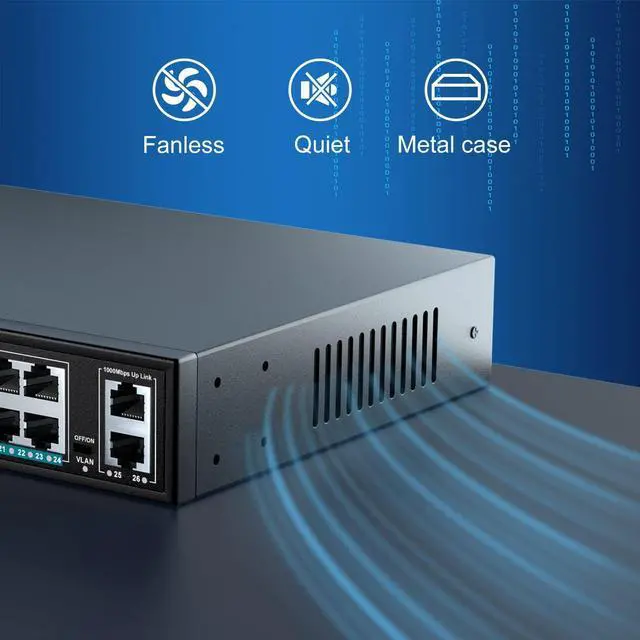 26-Port Gigabit PoE+ switch with 24 Port PoE+ 10/100/1000 Mbps RJ45 ports, 2 Gigabit Uplink ports. Uplink ports for connection to NVR, Internet, etc.