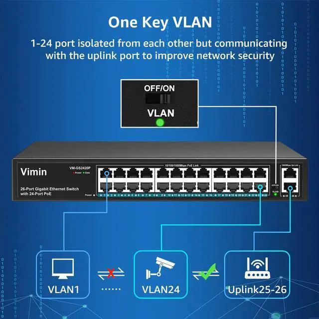 One Key VLAN mode, 1-24 ports isolated from each other but communicating with uplink ports to improve network security Improves monitoring of discontinuities and mosaics in the network, and can improve port bandwidth utilization.