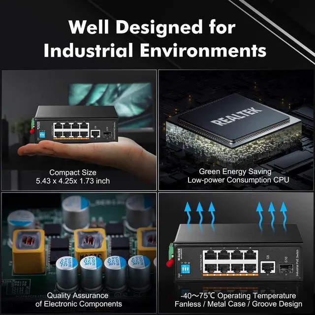 Vlan & Extend Mode, set by dial switch. Ports 1-8 are isolated from each other at VLAN mode, providing network security and reducing port interference. Increase the transmission distance to 250m (10Mbps) at extend mode1 DC Power and 2 Industrial power (4 pin terminal), total of 3-way power supply is more flexible. Automatic fault switching, anti-reverse connection does not damage the equipment, higher reliability. ***Please note that the power adapter is not included***IP30 protection grade, working temperature -40~75°C(-40~185°F), super robustness, anti-lightning, anti-static and anti-overload protection, adapt to various harsh environmentsSupport auto-negotiation, plug and play, no configuration needed, low-power consumption CPU, no fan quiet operation, green energy saving, suitable for various networks, such as home office, computer room, warehouse, factory, compact control box and other industrial scenarios with ethernet access