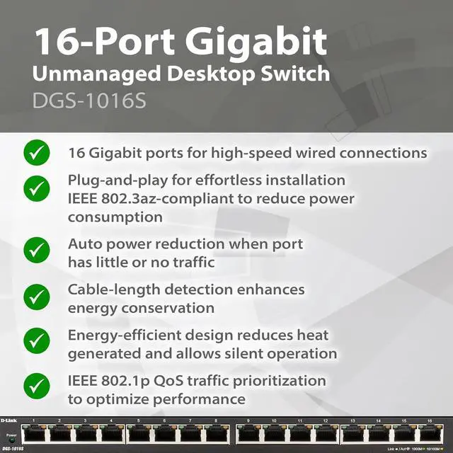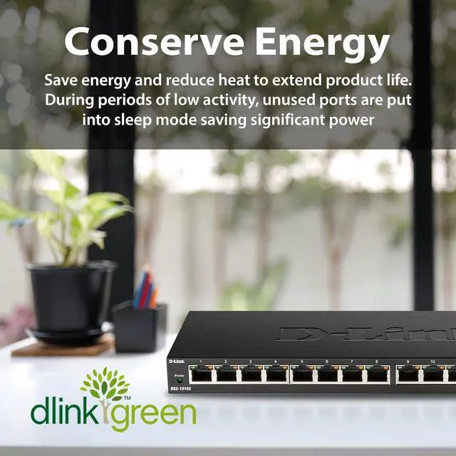 ENERGY-EFFICIENT DESIGN - Compliant with IEEE 802.3 az Energy Efficient Ethernet. Reduces heat generated and allows the switch to run silently while lowering the cost to operate.