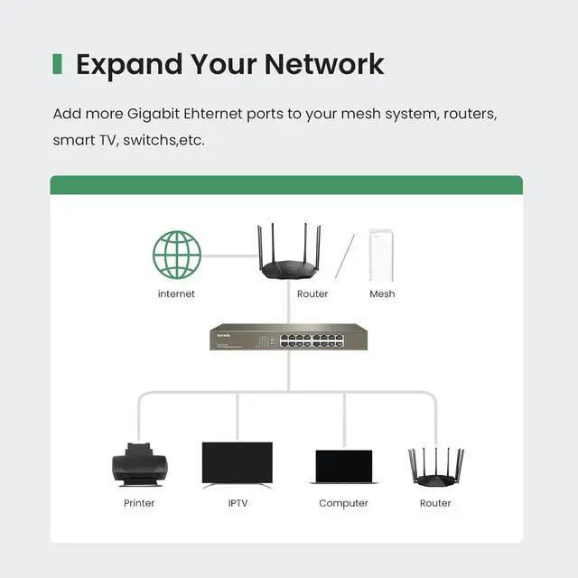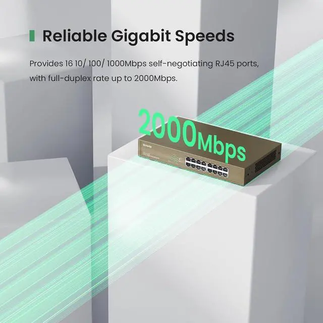 PORT CONFIGURATIONGigabit switch equipped with 16 10/ 100/ 1000Mbps Auto-negotiating MDIX RJ45 Ethernet ports. Add more Gigabit Ehternet ports to your Mesh System, Routers, etc
