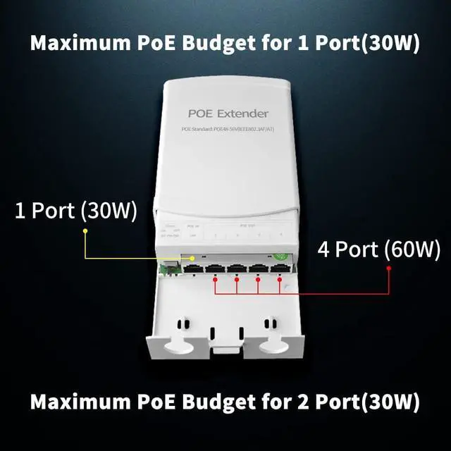 Extend Network 500M: One network cable connects two surveillance cameras. Single uplink port poe input, only 3/4 ports of poe extender are available. Support up to 30 watts PoE power ouput. The poe power source equipment provide 250m, PoE Booster can extend additional 250m for PoE network. For a total PoE network extension of 500m (1, 640 ft)