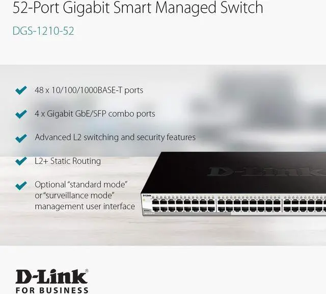 Advanced security features include Access Control List (ACL), 802.1X / RADIUS, ARP Spoofing Prevention, and D-Link Safeguard Engine