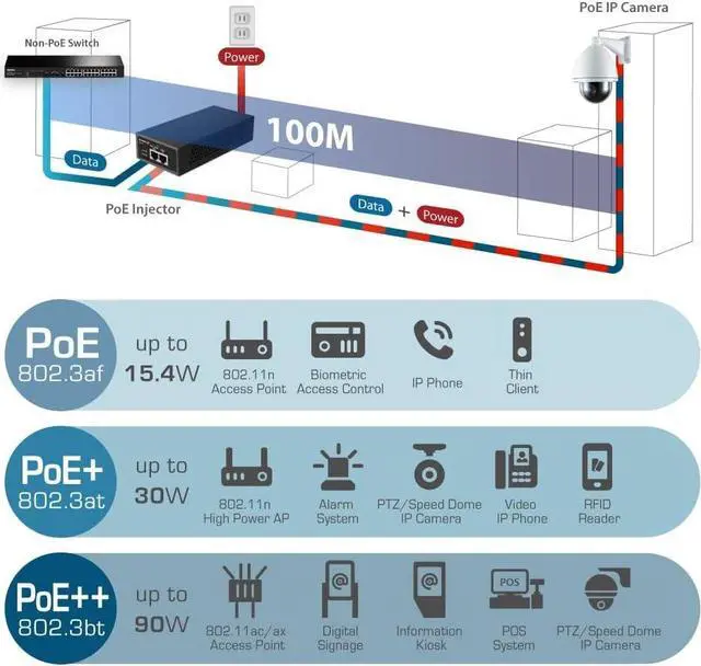 Provides 33W of power so PoE Powered Device (PD) can stay consistently powered by up to 30W for stable long-distance runs. Complies with IEEE 802.3 af/at Power over Ethernet (PoE) Standards.