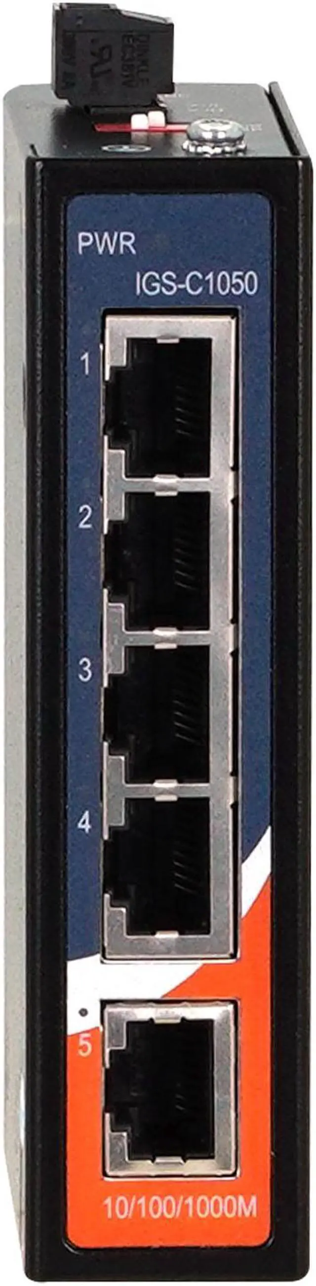 The IGS-C1050 is an unmanaged Ethernet switch with 5 x 10/100/1000Base-T (X) ports, offering reliable connectivity. Despite their compact size and lightweight design, these switches are highly versatile, making them exceptionally easy to install. With an extensive operating temperature range spanning from -10°C to 60°C, they effortlessly adapt to various operational environments. Renowned for their robustness, they stand as a dependable choice for Ethernet applications.